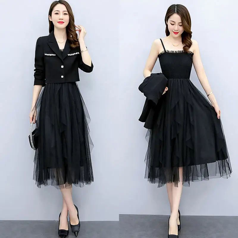 2025 Spring Autumn New Diamond-studded Short Suit Coat Dress Two-piece Women's Elegant Blazers Slim Suspender Mesh Skirt Set