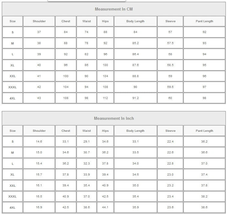 Size | Shoulder | Chest | Waist | Body Length | Sleeve | Pant Length |