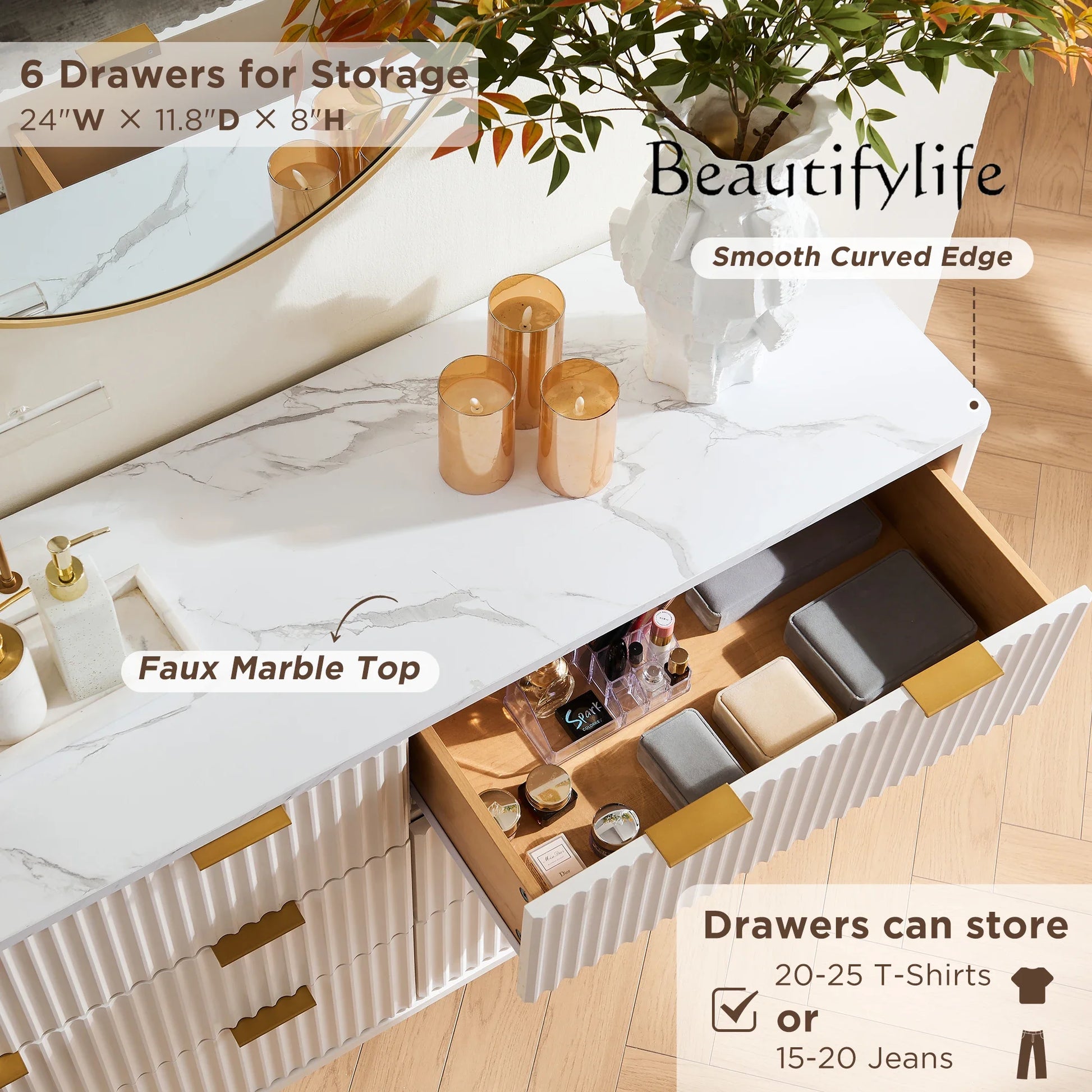 BJ Redlemon Fluted 6 Drawers Dresser, 54" Wide Modern Chest Of Drawers With Faux Marble Top