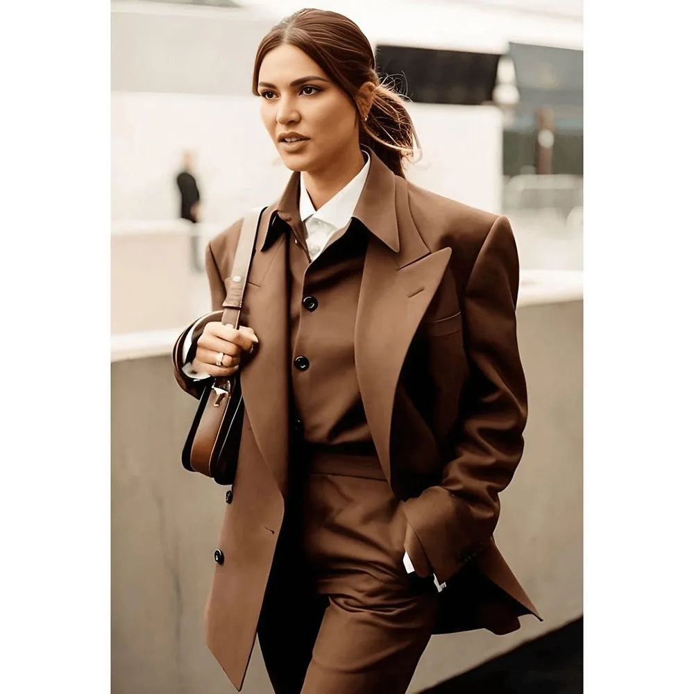 Classy Elegant Brown Suits for Women Notch Lapel 2 Pieces Jacket Pants Lady's Blazers Sets Smart Banquet Office Female Clothing