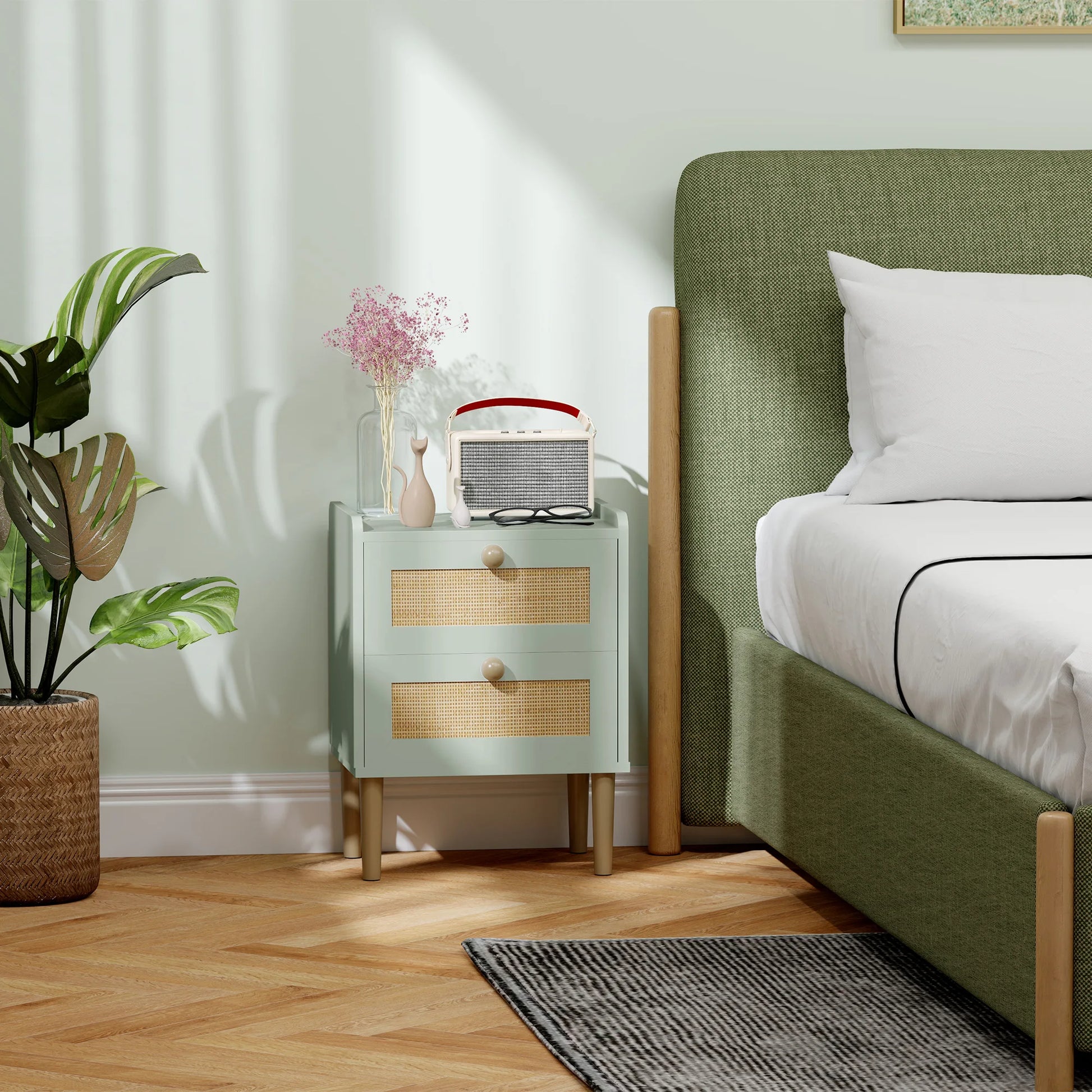 Brighten up your room with the HOMCOM bedroom drawers, featuring boho-chic rattan drawer fronts in a charming light blue and natural colour scheme. This drawer unit isn't just stylish-it comfortably fits three T-shirts or two jeans per drawer! Plus, its non-slip foot pads ensure it stands securely, making this rattan chest of drawers great for any space.