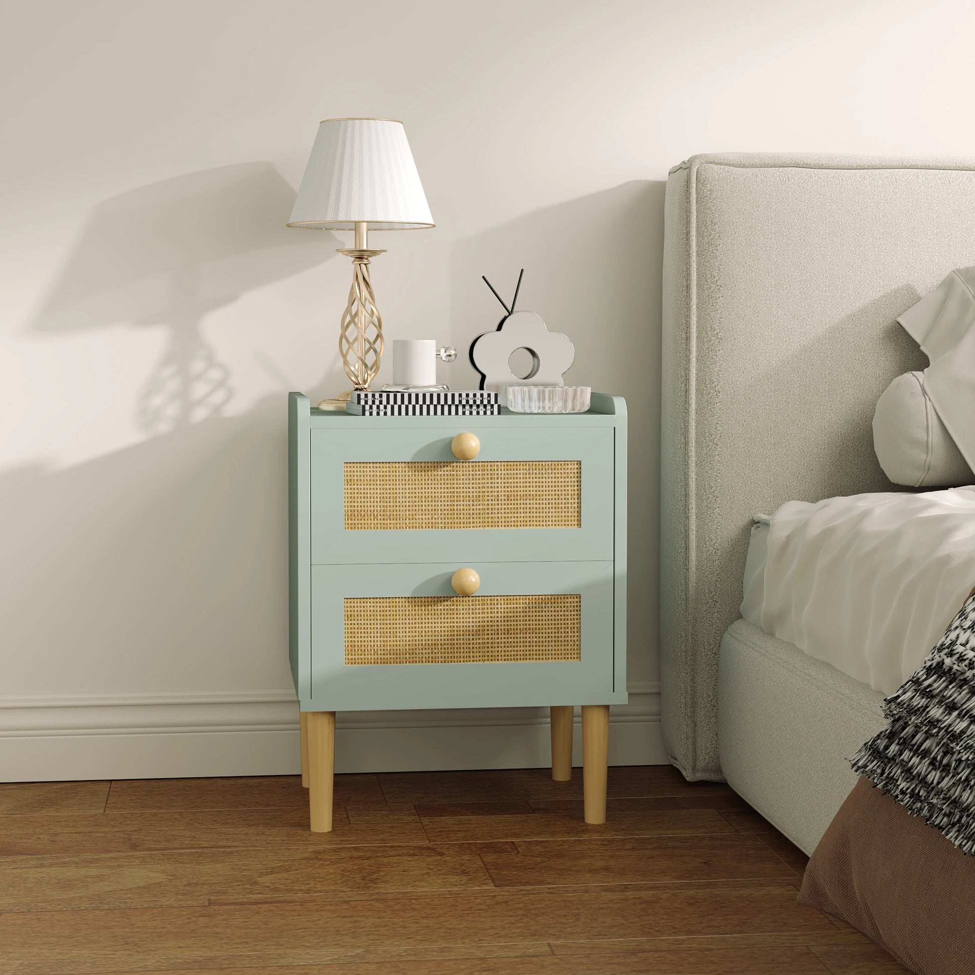 HOMCOM Boho Rattan Bedroom Chest of Drawers, 2 Drawer Dresser, Light Blue