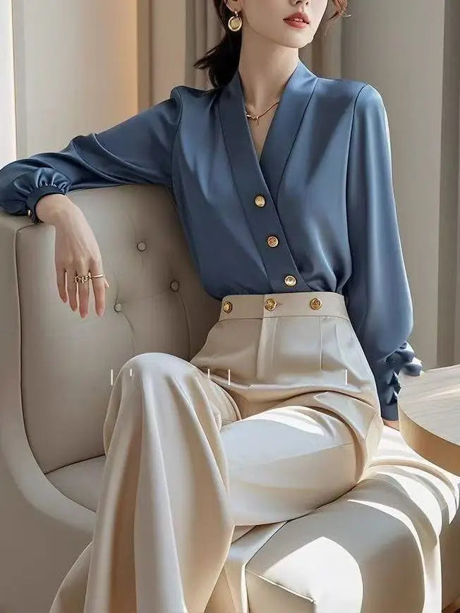 Hot Elegant Office Lady Outfits Autumn New Vintage Buttons V-Neck Long Sleeve Shirt + High Waist Wide Leg Pants Two piece Set