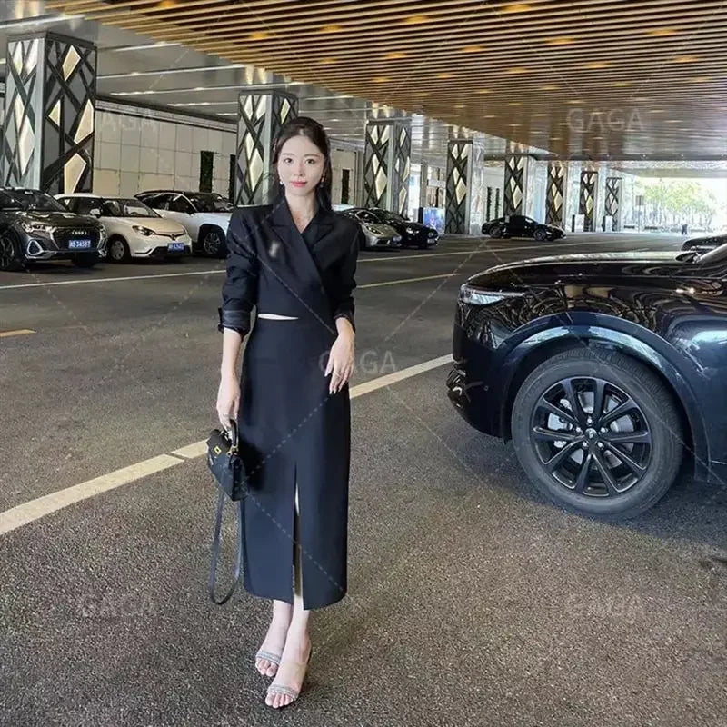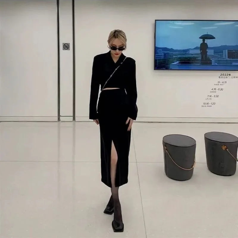 Insozkdg Gray-green Short Blazer Jacket + Split Skirt Sets Autumn New Korean Fashion Suit Two Piece Women Outfits Female Clothes