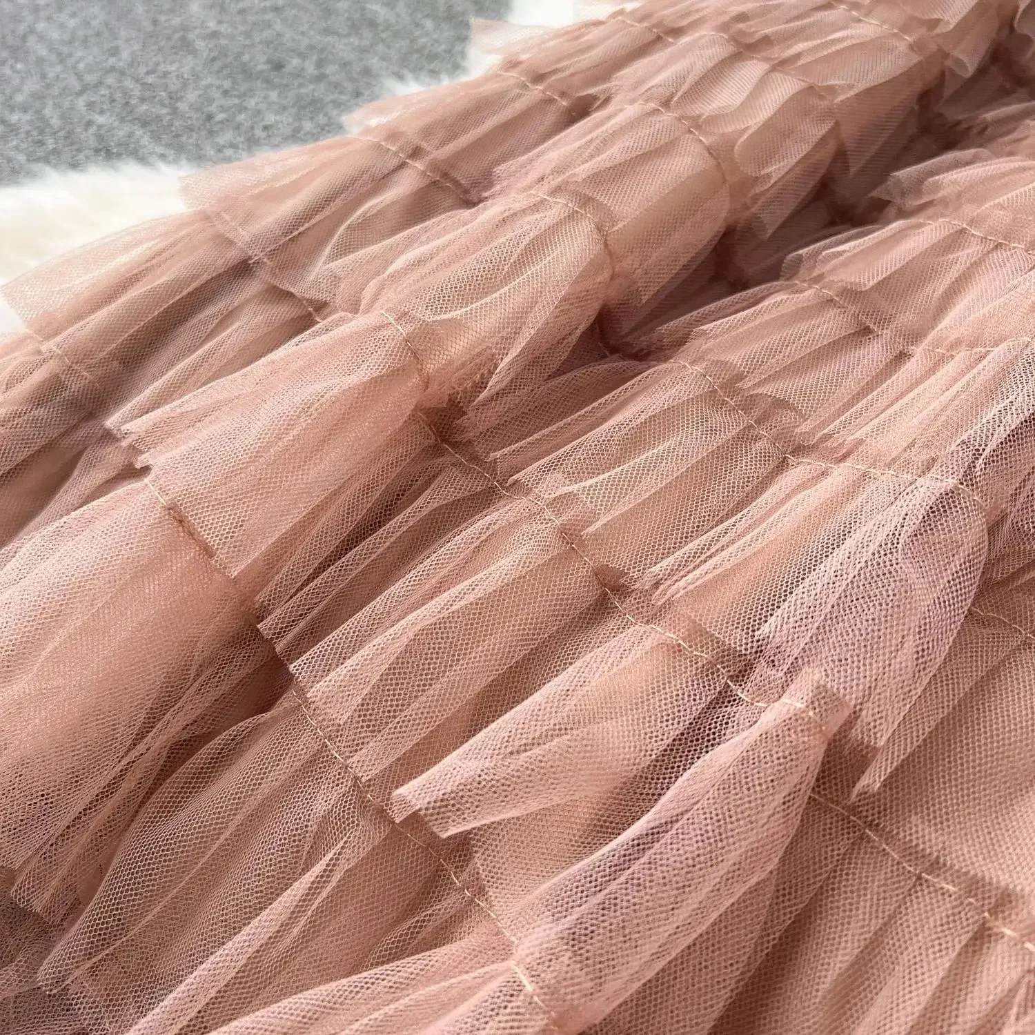 Pop 2024 Fashion Designer Suit Set Women's Notched Khaki Blazer Belt Jacket Coat + Midi Tulle Mesh Cake Skirt Two Piece Outfits