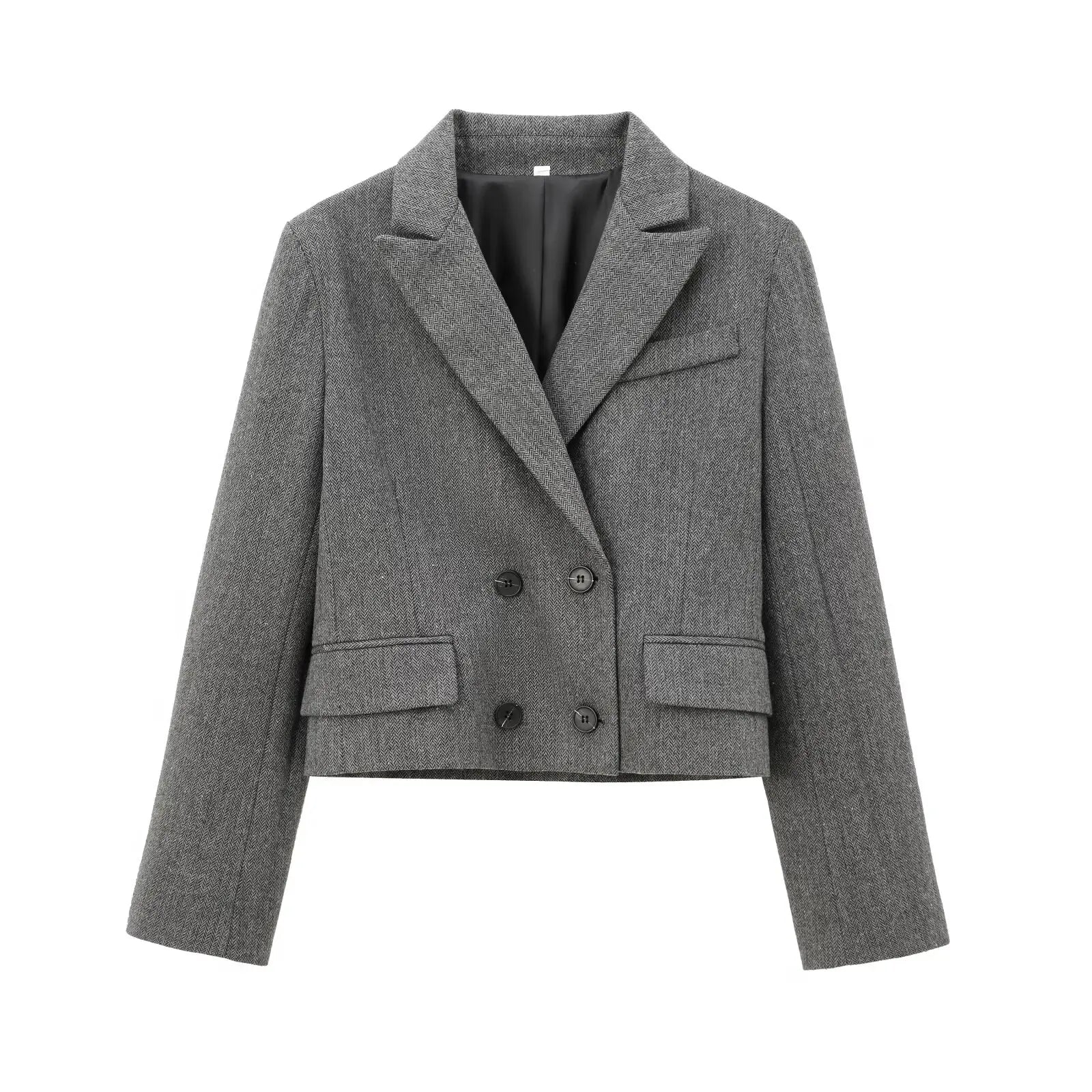 Autumn Women Gray Double Breasted Crop Blazer Long Sleeve Lapel Collar Office