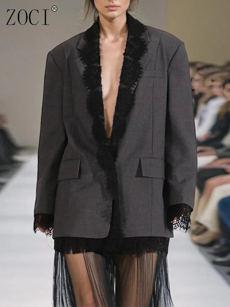 ZOCI Runway Look Women's Lace Patchwork Suit Jackets Notched Collar Female Blazers Fashion Design Coats Embroidery Tops 2024 New
